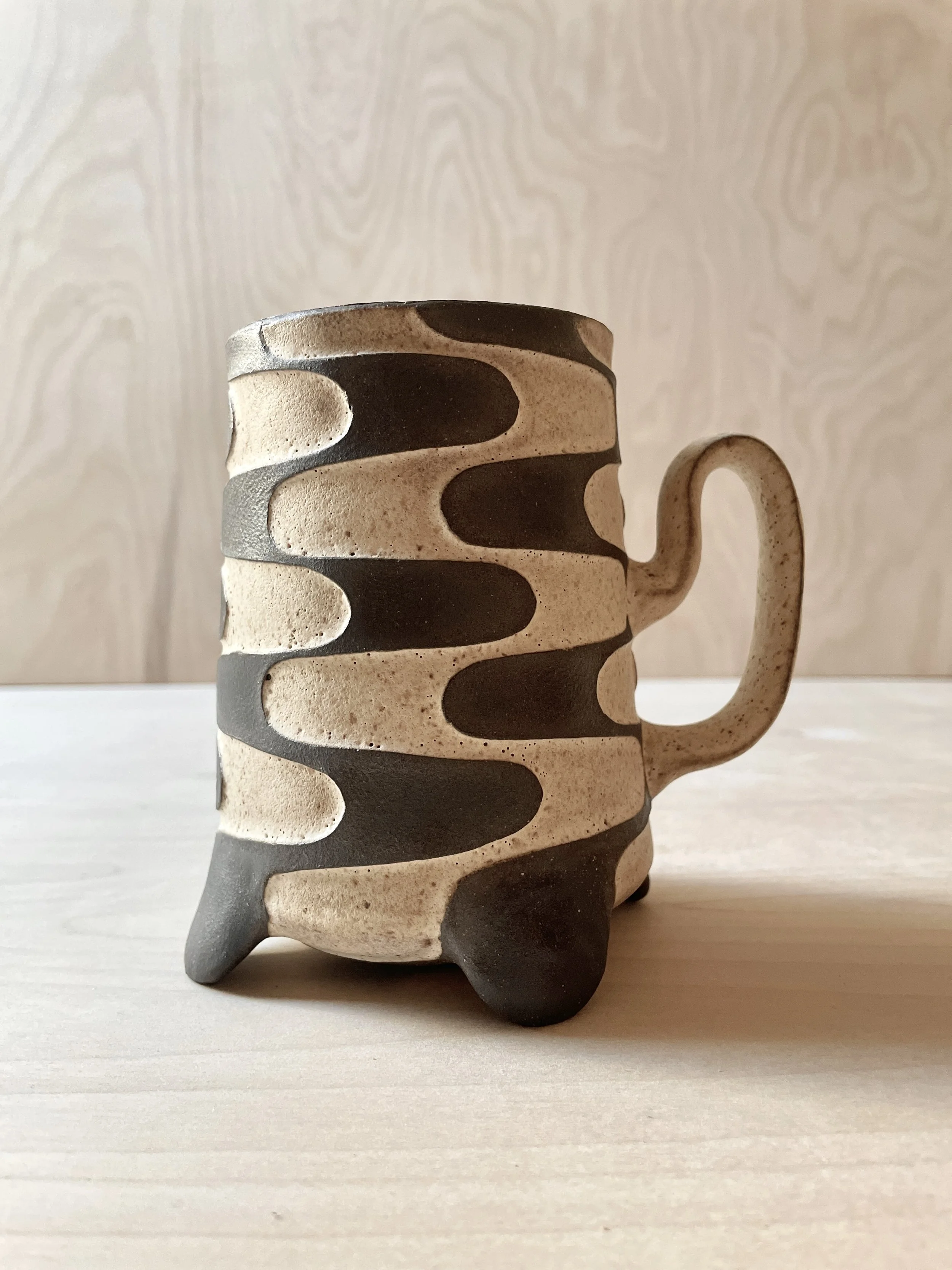 I make pots because I love the process. Functional pots solve problems. A good mug not only holds liquid without spilling, but fits snugly in someone’s hand, communicates with its environment, and shows up each day with consistency and warmth. Exciting new forms introduce problems that I get to solve through research, trial and error, and making lots of templates and tests. One pot informs the next, a constant and circular source of inspiration. Every angle should be considered. I try to incorporate the essence of each finished piece while the pot is still wet. Stamped texture and patterns are highlighted by glaze rather than